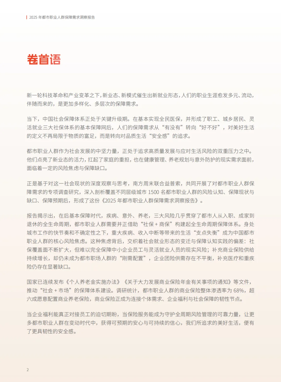 正是基于对这一社会现状的深度观察与思考,南方周末联合益普索,共同开展了对都市职业人群保障需求的专项调查研究,深入剖析覆盖不同层级城市 1500 名都市职业人群的风险认知、保障现状与缺口、保障预期后,形成了这份《2025 年都市职业人群保障需求洞察报告》。