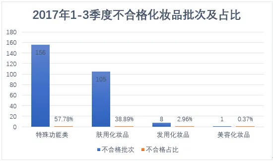 2017年1-9月,食药总局及各地食药监局共通告不合格化妆品270批次,涉及发用、肤用、美容类及特殊功能类产品。