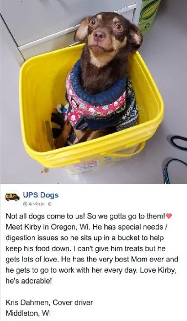 在一家宠物医院,快递小哥哥认识了一只叫做Kirby的狗狗:它有消化问题,每次吃完饭都得坐在这个桶里一会儿才能不呕吐...