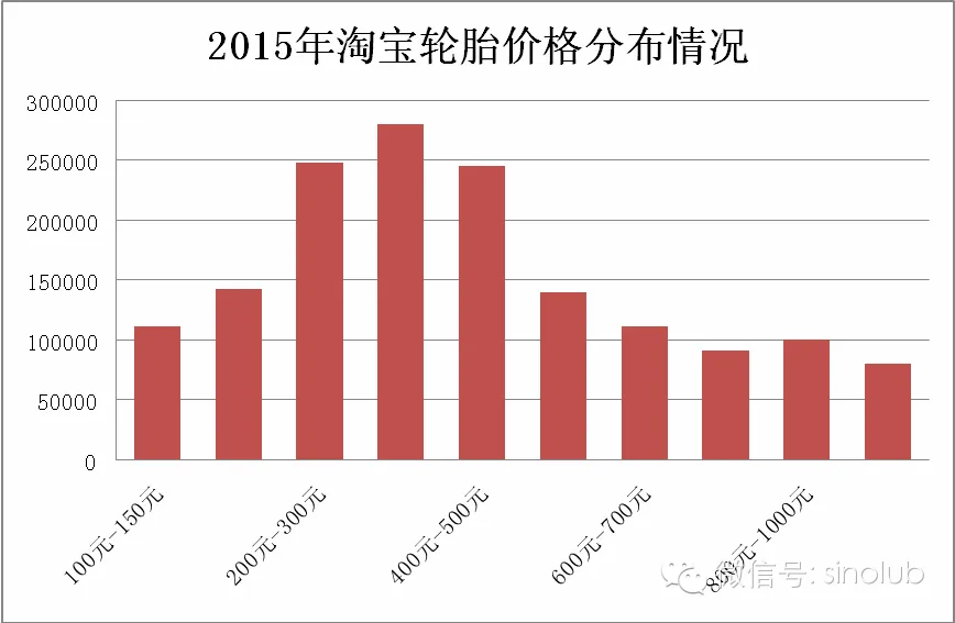 2015年,线上轮胎的销售价格基本维持不变,从150元到1500元不等,而200-500元的轮胎价格区间依旧最受消费者欢迎。本年度轮胎300-400元的成交量突破30000件大关。由此看出,平民化的价格仍然最受消费者的欢迎。