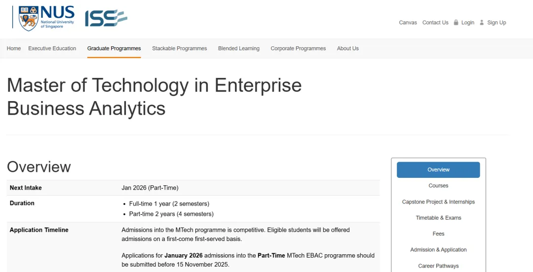 新加坡国立大学企业商业分析科技硕士(Master of Technology in Enterprise Business Analytics,官方简称MTech EBAC)课程是一项相对集中的课程,提供一年制全日制或二年兼修制教学模式,教学地点在新加坡。