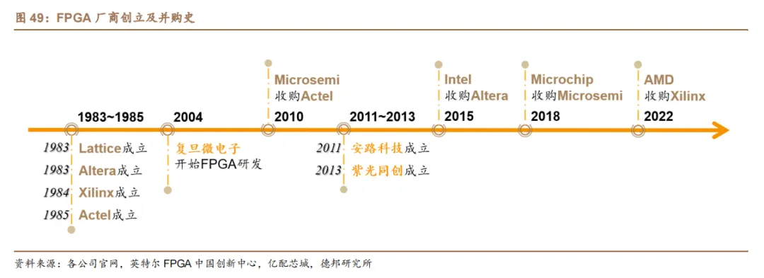 (2)第二阶段是从 2010 年开始、以大型并购案为特点的行业洗牌。随着半导体行业对 FPGA 的重视加大,Microchip、Intel 和 AMD 等半导体龙头纷纷下场收购与整合 FPGA 业务,尤其是 Xilinx 和 Altera 分别与母公司 AMD 和 Intel 形成 CPU+FPGA 的集合优势,战略部署数据中心应用。中国FPGA产业起步和发展较晚。复旦微电子自 2004 年开始进行 FPGA 研发,布局相对较早,安路科技和紫光同创也于 2011 和 2013 年相继成立。