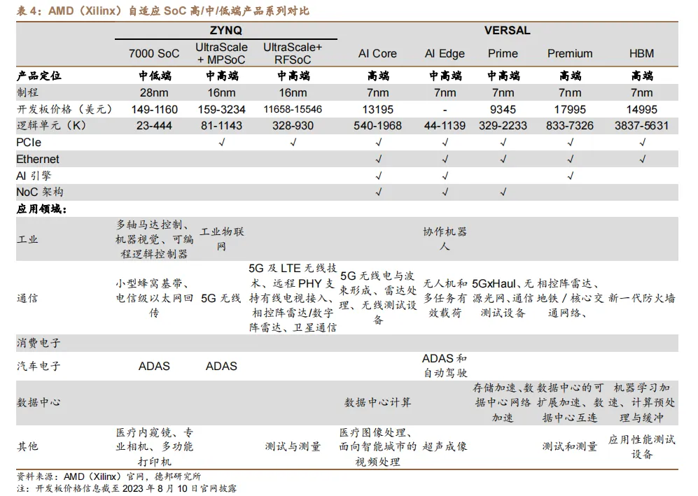 (2)从芯片架构来看,FPGA 单芯片向更先进工艺、更高速电路结构、复杂异构 SoC 系统发展,AMD(Xilinx)的 VERSAL 系列产品中集成了 PCIe、Ethernet 通信协议以及 AI 引擎、NoC 架构等。