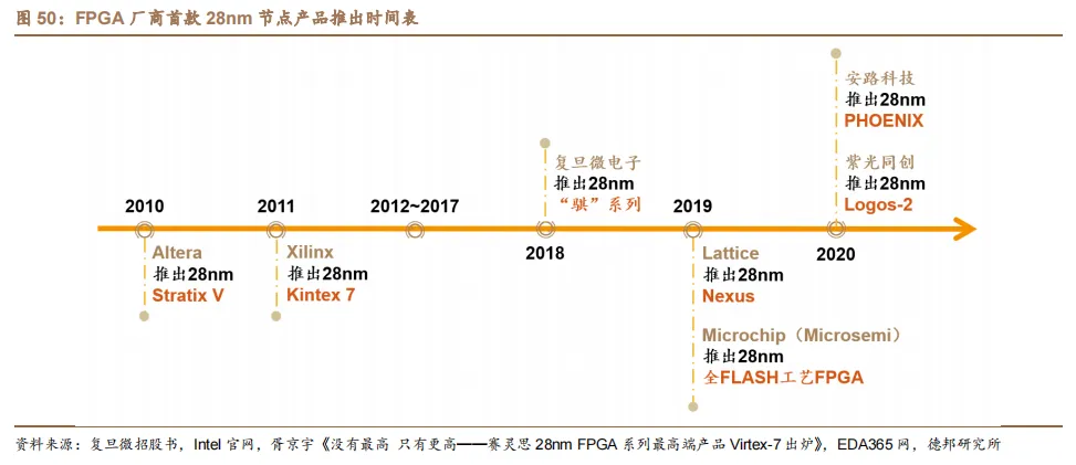首先在制造工艺方面,AMD(Xilinx)Versal 系列已经进入 7nm 制程工艺,Intel(Altera)与之对标的 Agilex 系列也已采用 Intel 7 制程工艺。国产厂商目前尚处于 28nm 的技术节点,且在 28nm 产品的推出节点上落后于两大国际龙头近十年。作为 FPGA 芯片性能的基础性指标,芯片制程仍然是国产替代突围的关键。