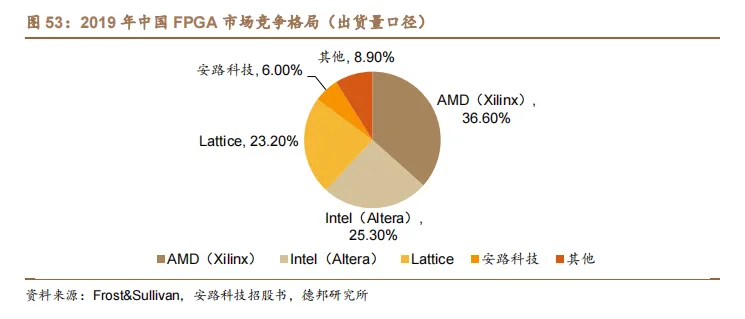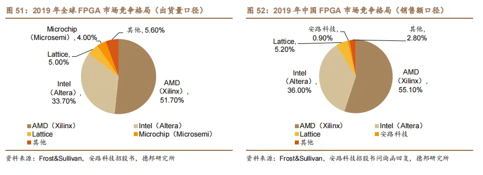 2019 年,AMD(Xilinx)、Intel(Altera)在中国市场的份额为 36.6%/25.3%(出货量口径),低于其在全球市场 51.7%/33.7%的份额。