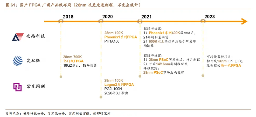 (1)国产 FPGA 已形成 28nm 产品系列,进军更先进制程。复旦微于 2018 年率先推出 28nm 亿门级 FPGA,安路科技与紫光同创于 2020 年先后来到 28nm 节点。各公司在更先进制程均已进行多年研发与积累,剑指国产FPGA 尚未触及的高端市场。