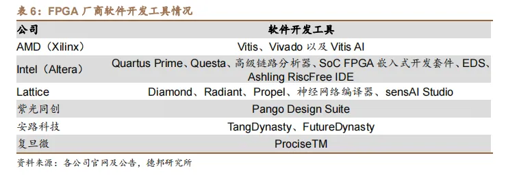 海外 FPGA 厂商已建立成熟的 EDA 软件生态环境。AMD(Xilinx)研发的Vitis、Vivado 以及 Vitis AI 设计工具可以帮助 AI 科学家、应用与算法工程师、嵌入式软件开发人员以及传统硬件开发人员等所有类型的开发人员使用 AMD 自适应计算解决方案。Intel(Altera)Quartus Prime 软件包含从设计输入和合成到优化、验证和模拟的所有步骤,另有 Questa 等多款其他软件,覆盖 FPGA、CPLD和 SoC FPGA 的完整开发工具。Lattice 也具有 Diamond、Radiant、Propel 等设计工具,提供专为 Lattice 器件而优化的设计流程。