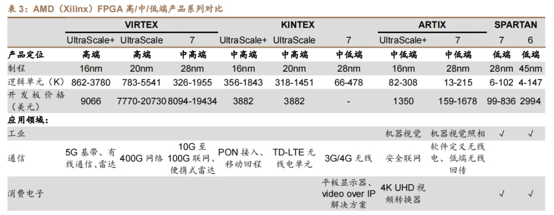 (1)从芯片制程来看,主要有 UltraScale+(16nm)、UltraScale(20nm)、7 系列(28nm)和 6 系列(45nm)四大类,VERSAL 则是整体升级为 7nm 制程。