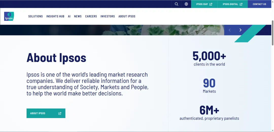 Kantar也属于市场研究平台,同样提供消费者洞察、广告效果和品牌评估的服务,Millward Brown(明略行)、TGI(目标群体指数)属旗下品牌,Kantar优势突出在广告创意测试、品牌健康度追踪等领域,并为客户提供定制化调研数据www.ipsos.com/zh-cn