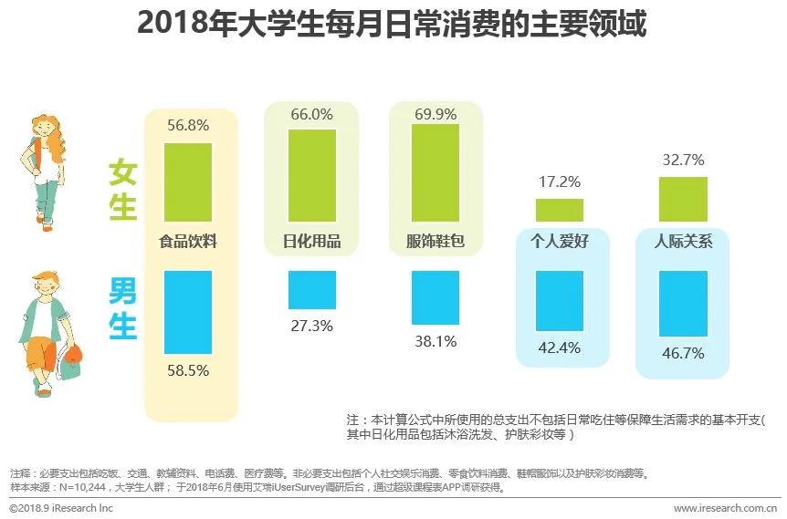 女生最主要的日常消费项目为食品饮料、日化用品和服饰鞋包,男生最主要的日常消费领域为食品饮料、个人爱好和人际关系;