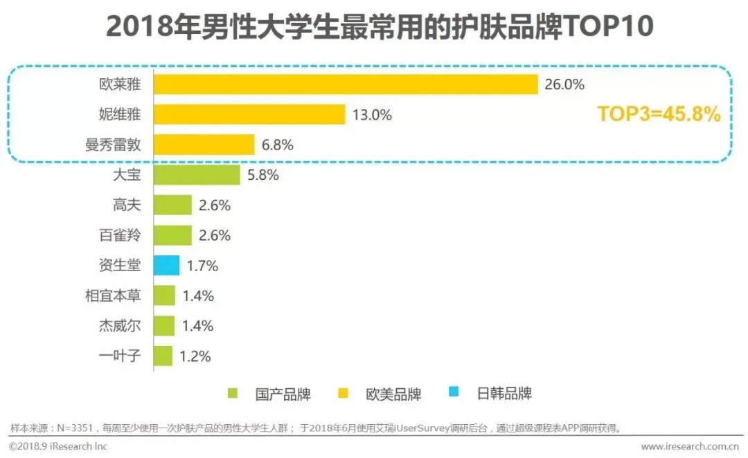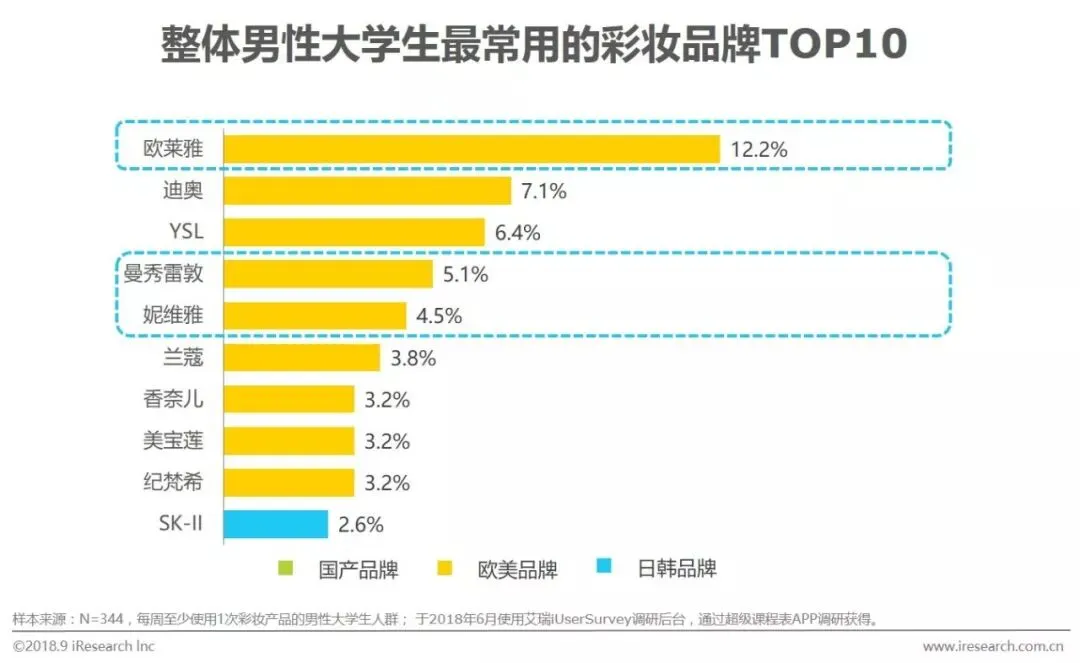 男性大学生最常用的护肤及彩妆品牌均为欧莱雅,欧莱雅在男生中的竞争优势尤为明显。另外,男生常用的10个彩妆品牌,基本都是欧美品牌。
