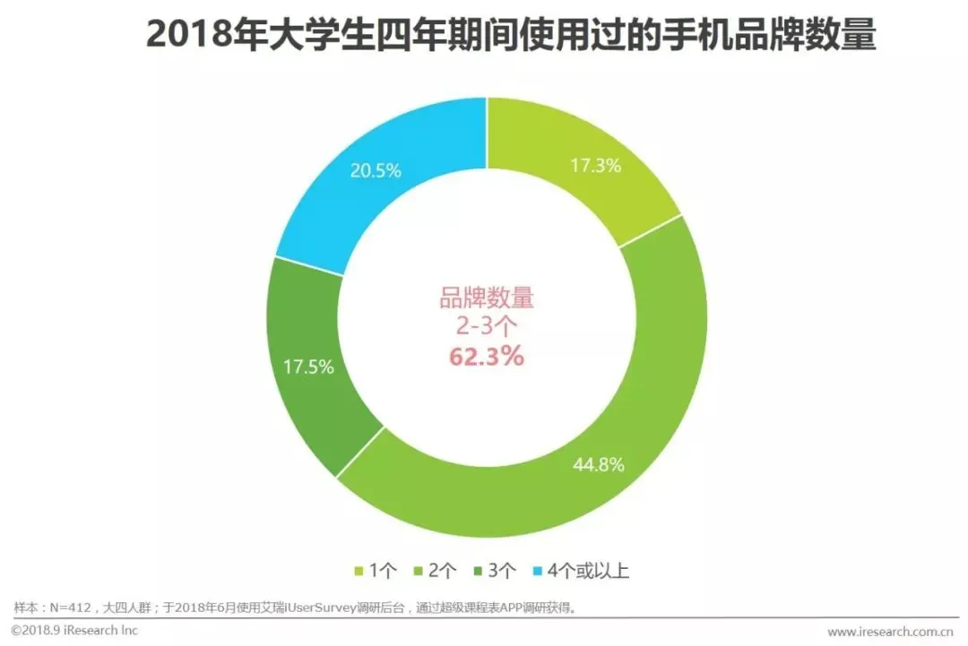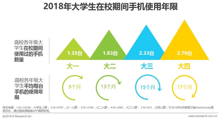 对大学生在大学就读期间更换的手机数量进行调研,大一学生平均使用的手机数量为1.35台,平均每台手机使用年限为9个月,大四学生平均使用过的手机数量为2.75台,平均每台手机的使用年限为17个月。除了大一学生,其他年级的学生单个手机使用时间均超过一年,可以推断大一新生更换到新环境后,有一波更换手机的需求。