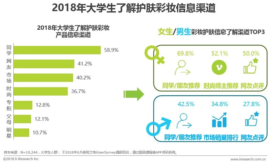 在购买护肤美妆产品前,身边的同学/朋友的推荐是首要的信息来源。其次,女生更容易受时尚博主推荐,而男生更倾向于参考市场销量。