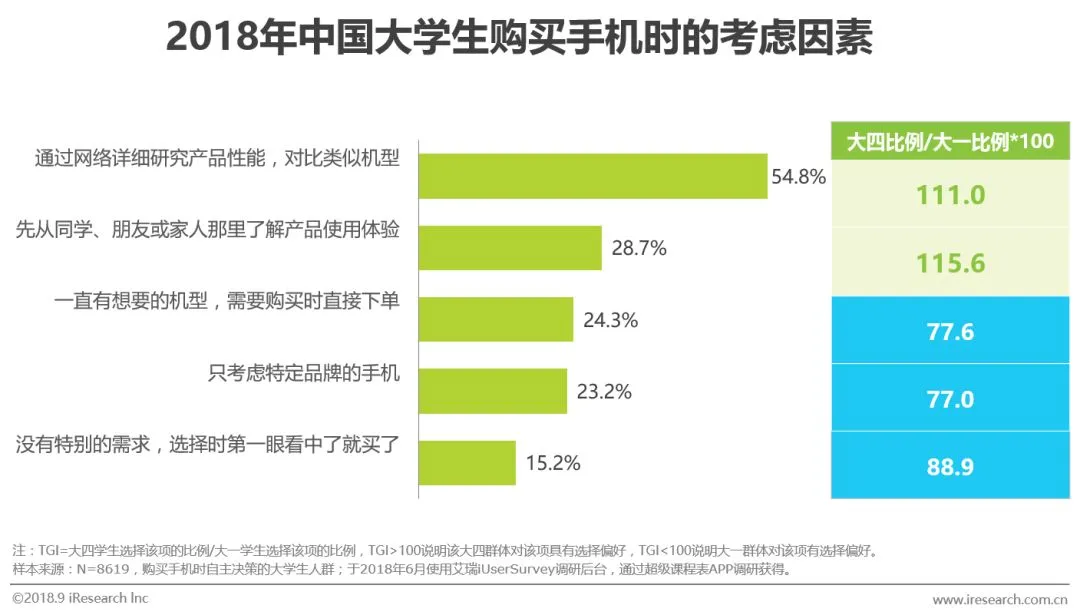 54.8%的大学生在购买手机前会通过网络详细研究产品性能,对比类似机型,网络信息在很大程度上影响手机购买决策。男生在倚赖网络信息上的比例高于女生。相比男生,女生对亲友的建议更为看重,并更容易冲动购买。