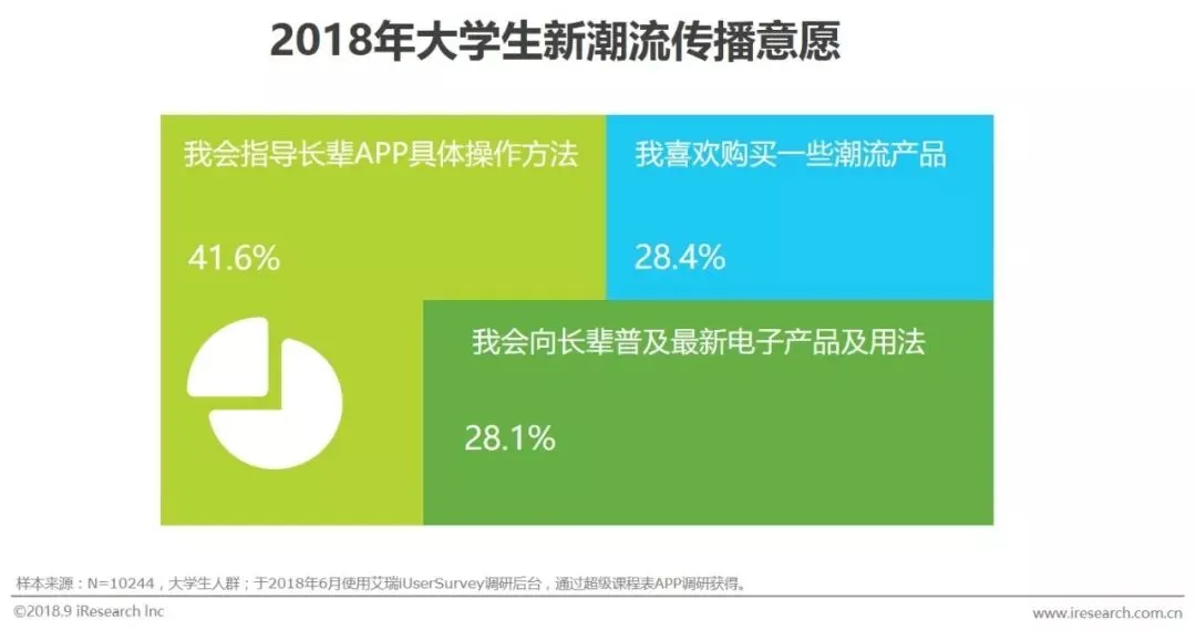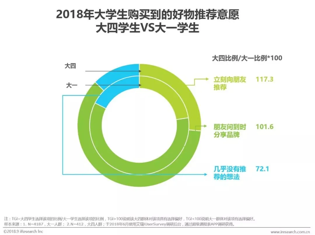大学生对新产品和新品牌的接受度更高,同时也会在生活中传播使用体验,会指导长辈手机使用和潮流电子产品的使用。大四学生发现好用的产品之后立刻推荐的比例为26.5%,大一学生的比例为22.6%,两者相比的TGI为117.3。大四学生的品牌经验相对更为丰富,相对大一学生,更乐于推荐好用的产品。