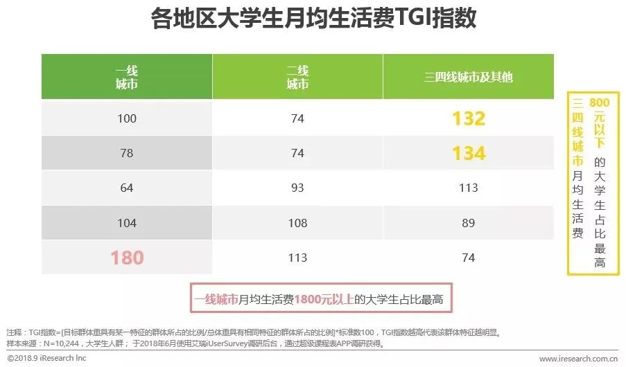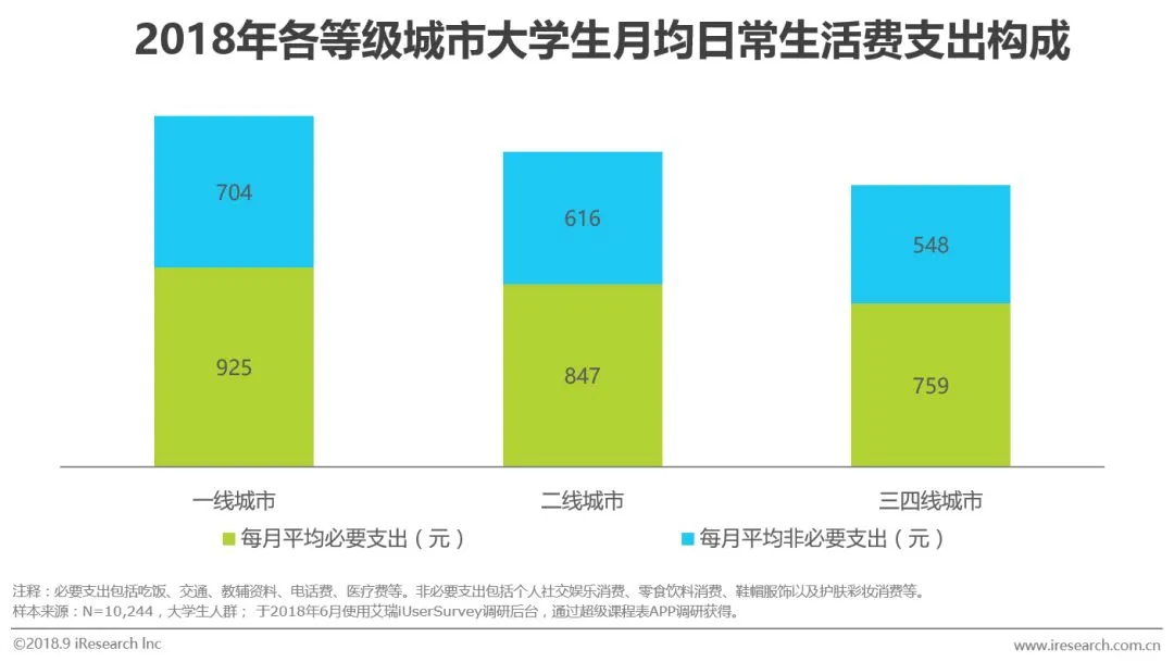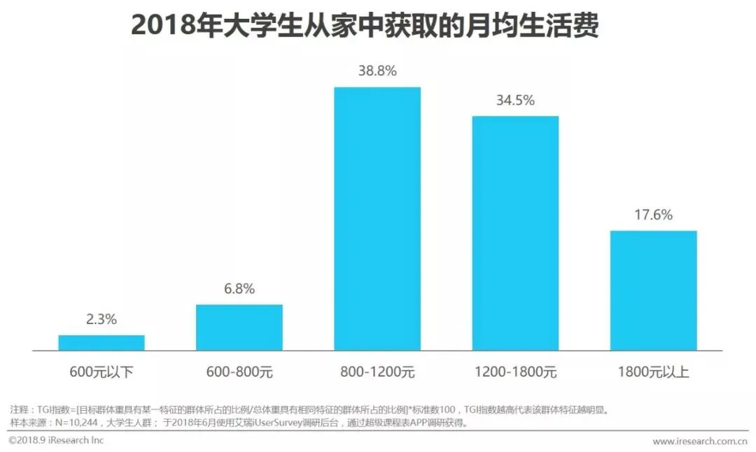 由于大学阶段的休闲娱乐及个人社交形式更为丰富多样,因此大学阶段的生活成本会更高。根据调研数据显示,2018年大学生从家中获取的月均生活费约为1405.3元,较高中阶段月均730.9元,将近翻一番。此外,位于一线城市的大学,其学生月均生活费在1800元以上的占比更高。