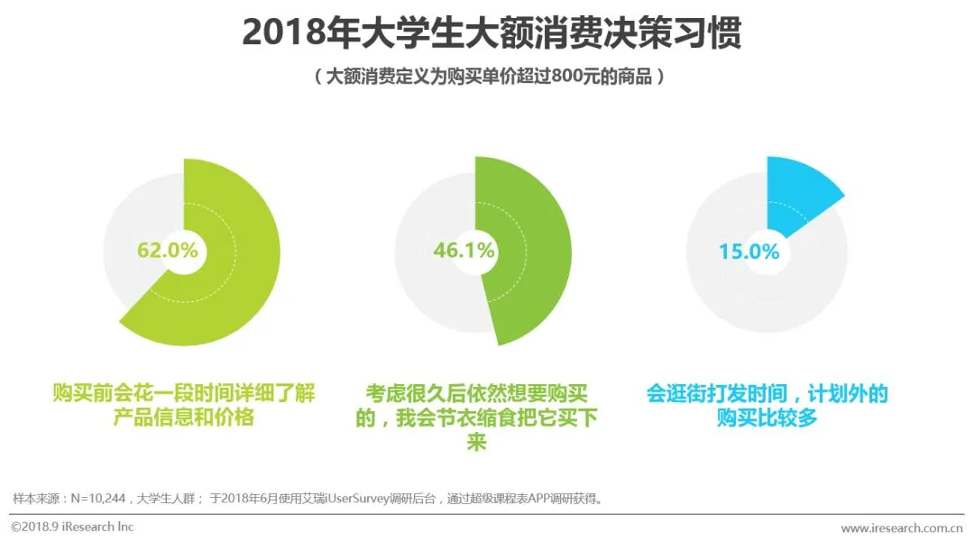 对于购买单价超过800元的商品,62%的大学生在购买前会花一段时间详细了解产品信息和价格,46.1%的大学生会节衣缩食进行必要的大额消费。15%的大学生会在逛街时冲动购买大金额商品,比例较低。