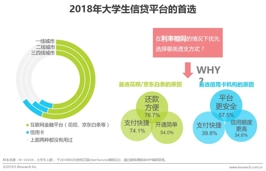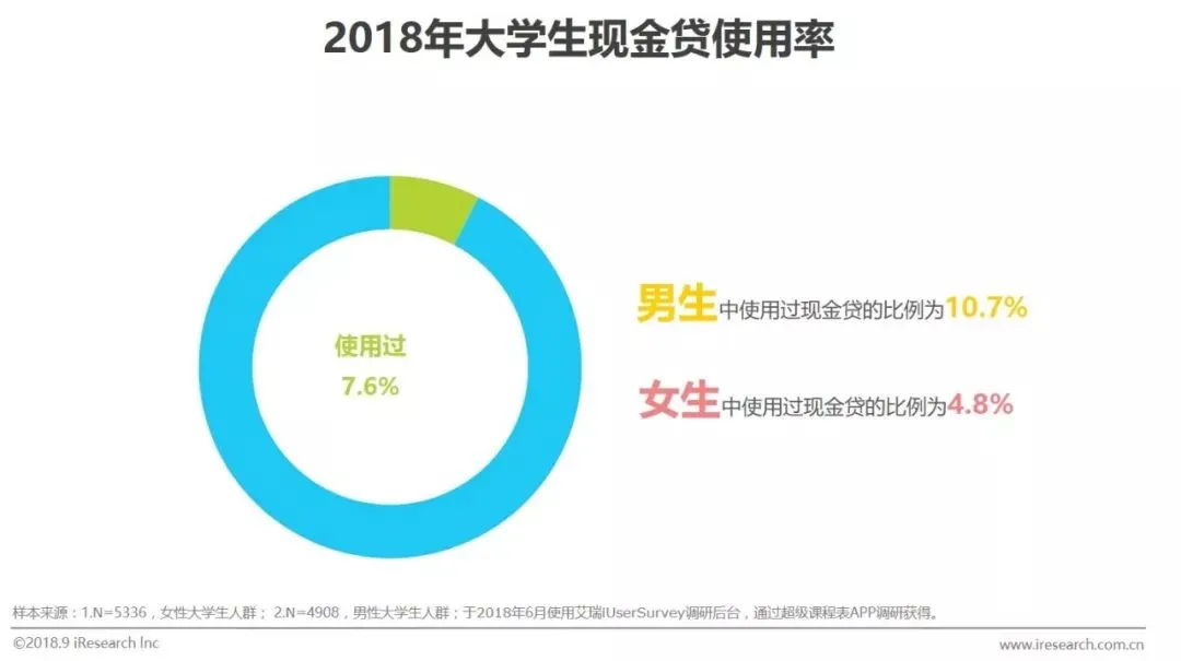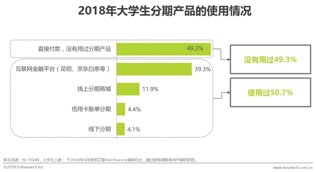 大学生使用线上支付的比例达96.8%;在利率相同的情况下,53.1%的大学生优先考虑花呗和京东白条作为透支方式;提前消费意识强,50.7%的大学生使用过分期产品,39.3%的大学生在互联网金融平台(花呗、京东白条等)申请过分期;7.6%的大学生使用过现金贷产品,男生提前消费意识高于女生。