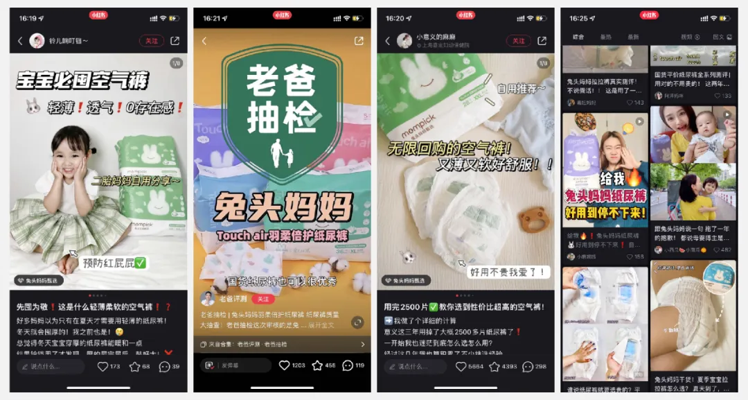 通过人群洞察发现,小红书站内用户群体普遍存在「怕买贵,更怕没买对」痛点,结合兔头妈妈纸尿裤价格及品质,辰木便提炼出「性价比国货纸尿裤」这一产品核心记忆点,围绕“性价比超高”、“国货品质保证”、“性价比国货”、“屁粮自由”等关键词,邀请不同量级的母婴垂类KOL/KOC与用户进行多维度话题互动,以「自身使用分享推荐+头部权威评测」的笔记种草类型,突出纸尿裤的透气、亲肤、干爽、防侧漏等卖点,丰富纸尿裤的营销场景,以此完成用户心智收割。