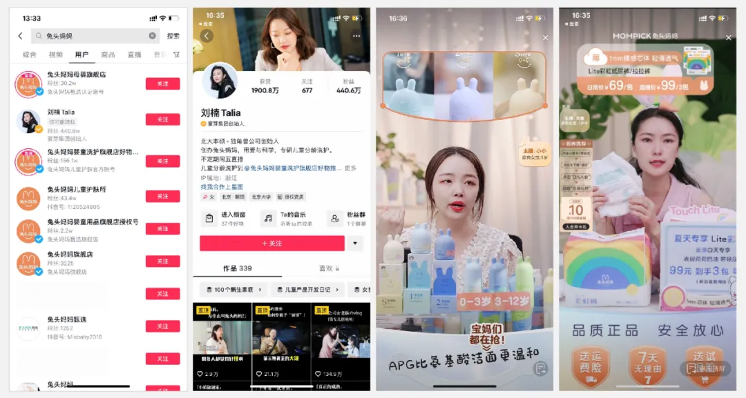 2019年,兔头妈妈甄选创始人&蜜芽创始人刘楠注册抖音账号。2020年9月19日,刘楠在抖音开启“楠得好物”直播首秀,当晚母婴用品销量超过15万件,首次进入直播间的兔头妈妈甄选纸尿裤大爆发,以1500万+的销售额成为母婴带货商品榜第一。
