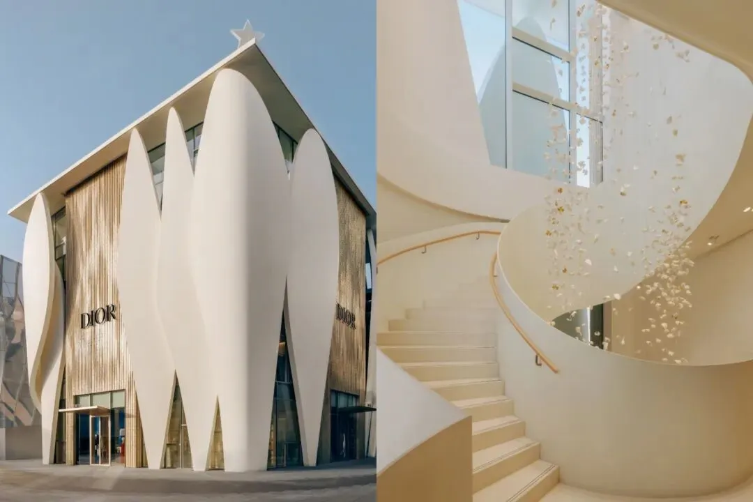 建筑由普利兹克建筑奖得主 Christian de Portzamparc 操刀设计。外立面以花瓣状尖拱构成立体轮廓,灵感源自 Christian Dior 构思高级订制服装时的线条张力;手工烧制的金色玻璃砖嵌入其间,在流动的结构中引入中国文化所象征的尊贵色彩,让建筑本身成为一件值得观摩的作品。