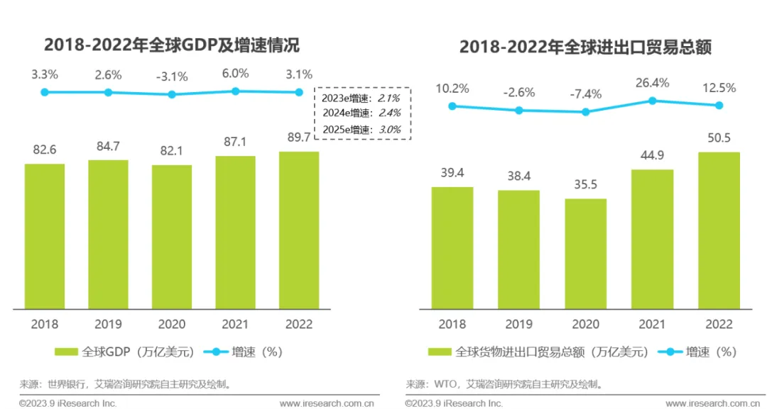 2022年全球GDP总量达到89.7万亿美元,同比增速放缓至3.1%。据世界银行预测2023年全球GDP增速将进一步下滑至2.1%,经济运行压力增大。作为全球经济的核心组成部分,2022年全球进出口贸易总额达到50.5万亿美元,受宏观经济形势对供需两侧的持续性影响,相较于前一年,2022年全球进出口贸易增速放缓至12.5%。在未来全球经济下行压力犹存的环境下,进出口贸易发展空间虽然会面临一定挤压,但受制于逆全球化的高昂成本,未来各国家地区间的贸易流动将依然保持活跃,全球进出口贸易仍具备一定的发展韧性。