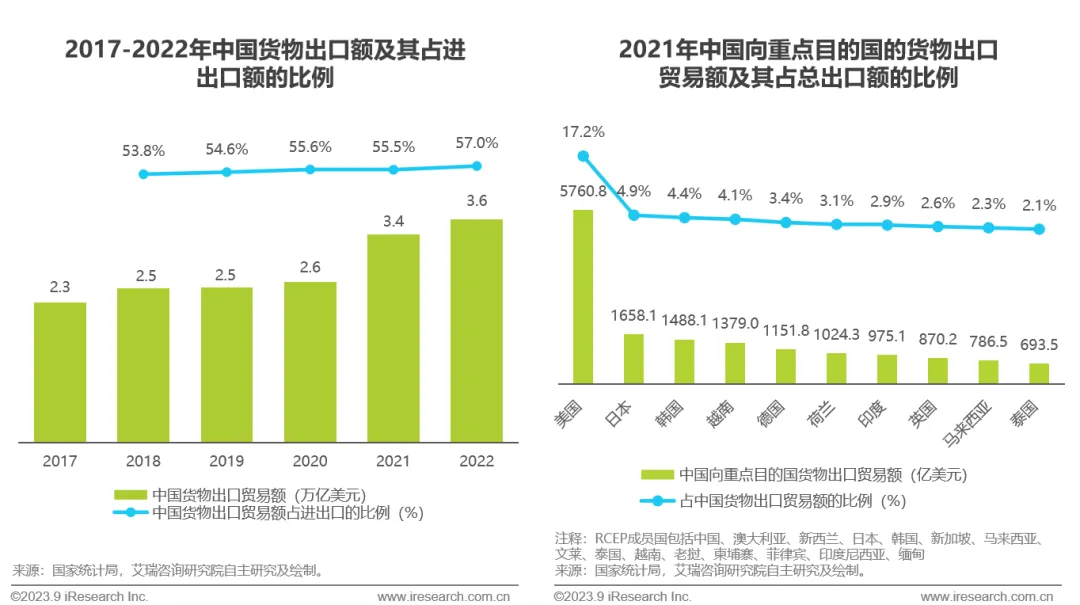 欧美地区高通胀带来的本地物价提升以及《区域全面经济伙伴关系协定》(RCEP)政策落地等因素推动中国商品竞争力提升,2022年中国货物出口贸易额持续回暖,达到3.6万亿美元,占进出口贸易总额57.0%,出口占比稳步提升。2021年欧美与RCEP成员国为中国货物出口的主要目的国,中国将与主要贸易合作伙伴构建更加深度的合作关系以进一步释放海外市场潜力,以保持中国出口贸易的增长韧性。
