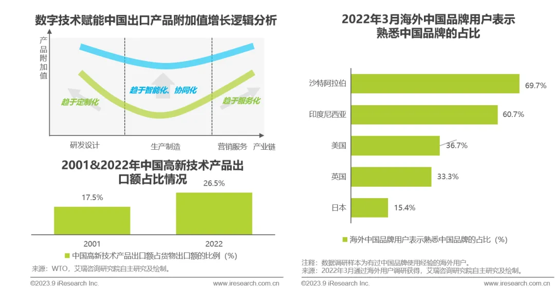 中国数字经济兴起带动了出口技术复杂度增长,进一步提升了中国在全球价值链的参与度与分工地位,中国出口产业链逐渐向微笑曲线两端延伸,加之数字技术愈发成熟,赋能产业链智能化、协同化,拉动微笑曲线整体上移并趋于扁平化,2022年中国高新技术产品出口额占货物出口额的比例达26.5%,相比中国加入WTO之初已增长9个百分点,高附加值出口产品比重逐渐提升,跨境出口电商的利润空间正逐步打开。此外,由于海外市场可拓展空间与增长潜力较大,近年众多品牌开始出海,中国品牌在海外的认知度与信任度日益向好,为跨境出口电商提供充足的成长空间。