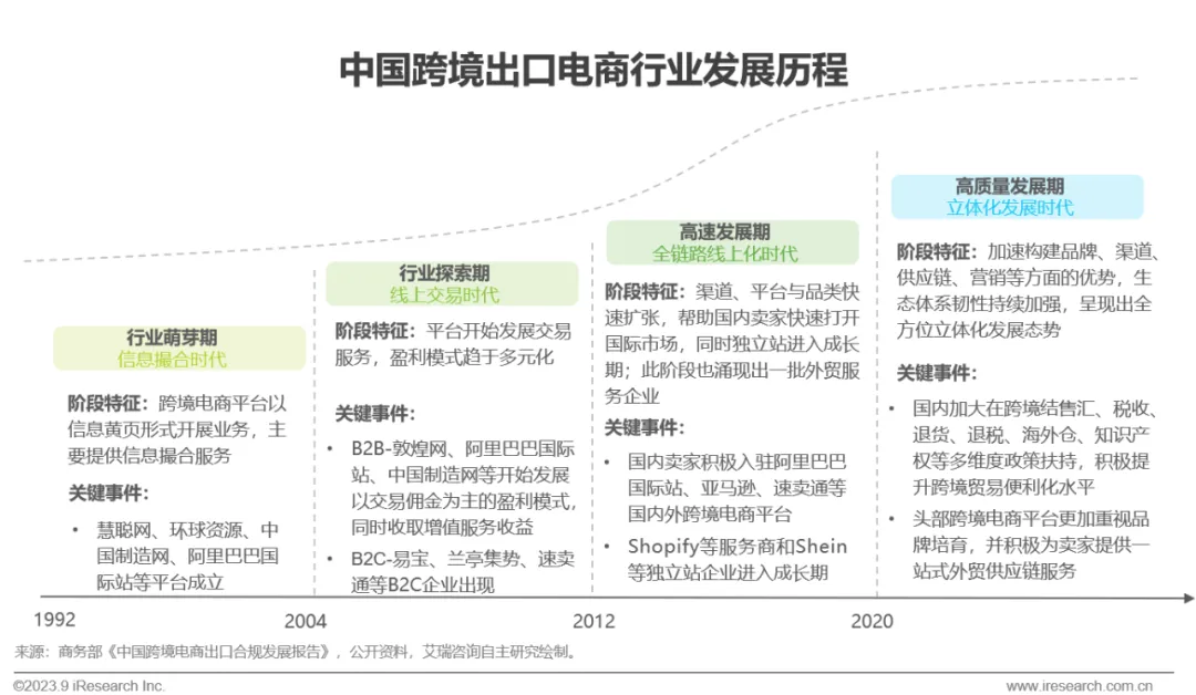 经历数十载,我国跨境出口电商行业经历了从构建信息平台、发展交易服务、完善生态链条到追求立体化发展的演变进程。发展之初,跨境出口B2B平台率先探索出信息撮合和交易服务的商业及盈利模式;随后,国内跨境出口卖家业务拓展需求的激增进一步推动了平台与服务商市场的繁荣,并为后续卖家品牌化培育打下良好基础;最后,随着合规与标准化体系的建立,行业也正式迈入高质量发展阶段,通过前期在品牌、渠道、供应链、营销等方面的经验积累,各大平台与服务商加强资源整合,为品牌商提供更全面的一站式服务,提升跨境出口业务便利度,促进行业健康有序发展。