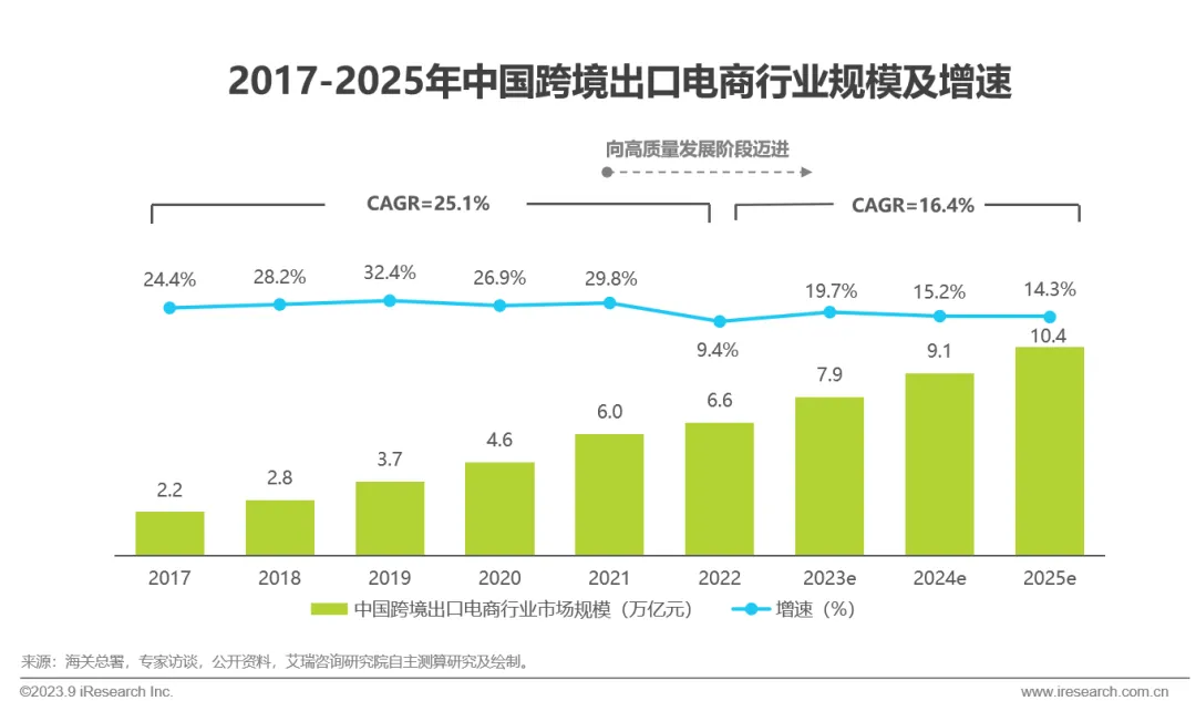 2017-2021年之间,中国跨境出口电商行业规模持续保持着高于20%的同比增速,叠加疫情对世界各国消费端线上化的加速效应,2021年跨境出口电商行业规模已突破6万亿元。2022年受到局部封控导致的供应链压力和国际形势变化等因素的综合影响,跨境出口电商行业边际增速受挫,但全年依旧实现了9.4%的同比正向增长,规模也达到了6.6万亿元。艾瑞预计未来三年伴随经济复苏,行业边际增幅将会逐步修复,并以16.4%的年均复合增长率实现稳中有进的发展,至2025年突破10万亿元。