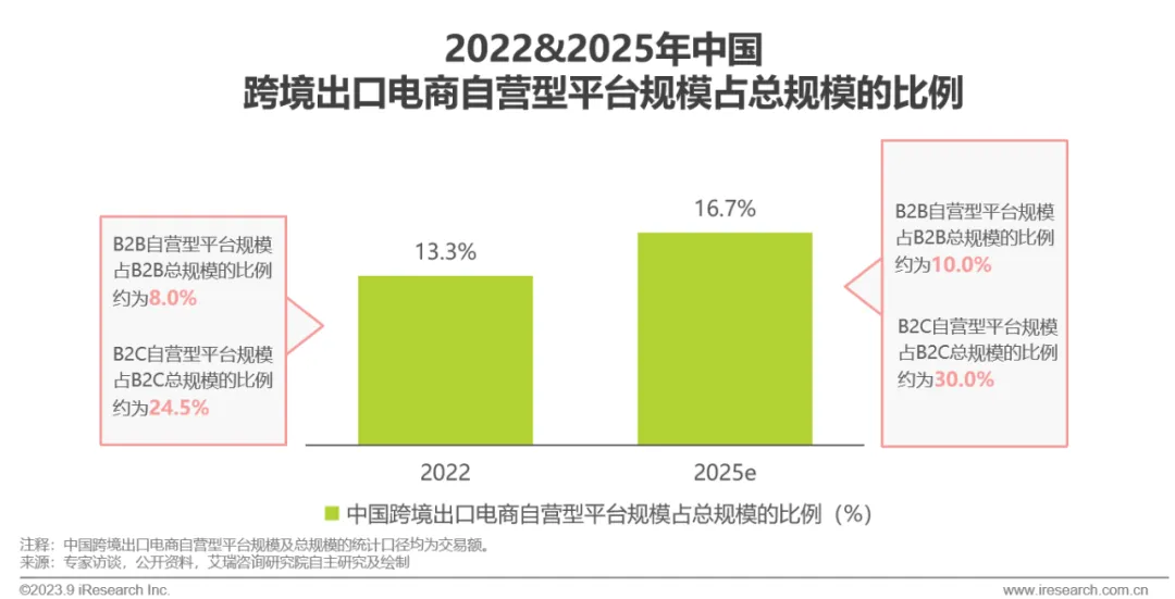 整体来看,2022年中国跨境出口电商自营型平台规模占总规模的比例为13.3%,2025年增加至16.7%,自营型平台占比呈现上涨趋势。从B2B的角度看,2022年B2B自营型平台规模占比为8%,随着海外采购商年轻化趋势凸显,采购商倾向于借助社媒渠道触达国内品牌商,催化国内B2B卖家自营型平台渗透率进一步提升,2025年B2B自营型平台规模占比预计达10%;从B2C的角度看,2022年B2C自营型平台规模占比为24.5%,虽然流量成本持续走高使部分B2C自营型平台关闭,但具备较强实力的头部品牌商仍倾向于通过社媒渠道精准触达品牌的目标群体以不断提升销售规模,且经第三方开放式平台培育成熟的跨境卖家为提升品牌影响力会逐步布局自营型平台,2025年B2C自营型平台规模占比预计达到30%,相较于2022年上升5.5个百分点,其增幅高于B2B自营型平台占比的变化幅度。
