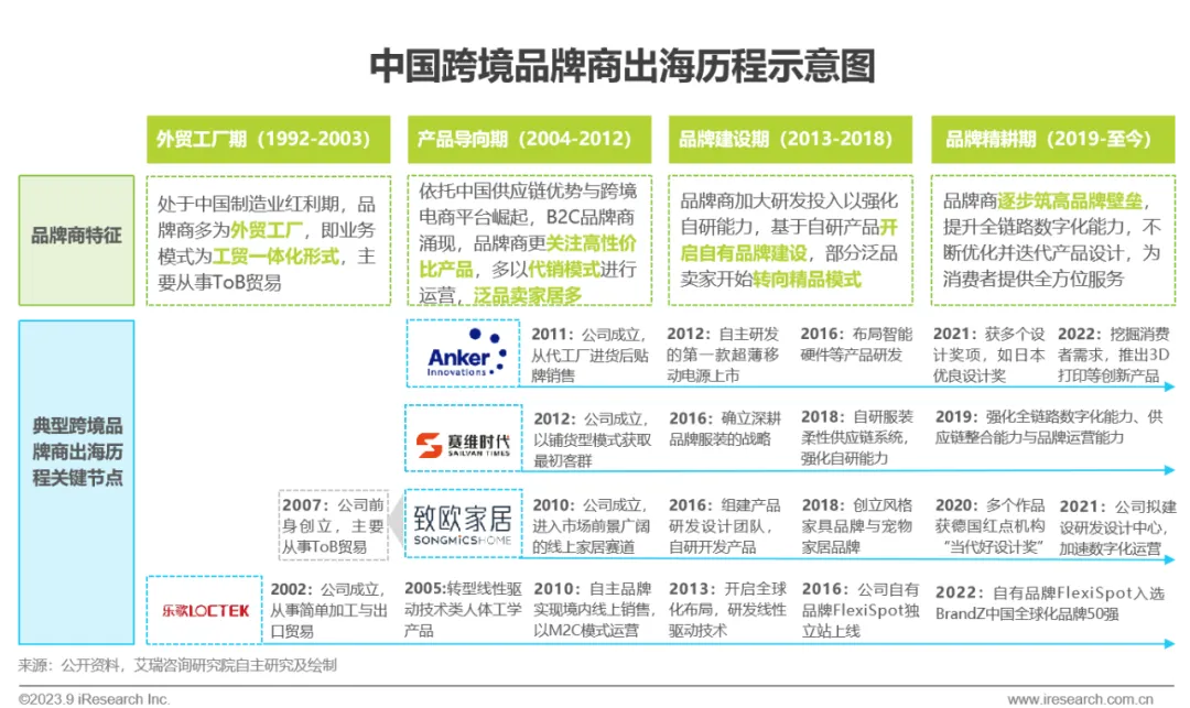 起源于外贸工厂,历经产品导向期与品牌建设期,逐步迈向品牌精耕期