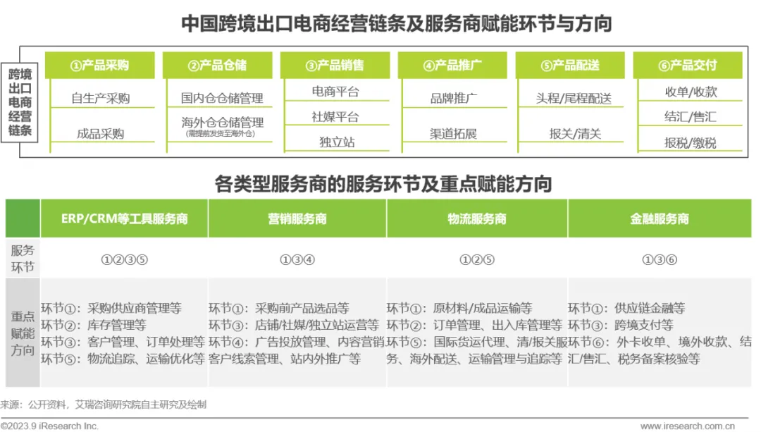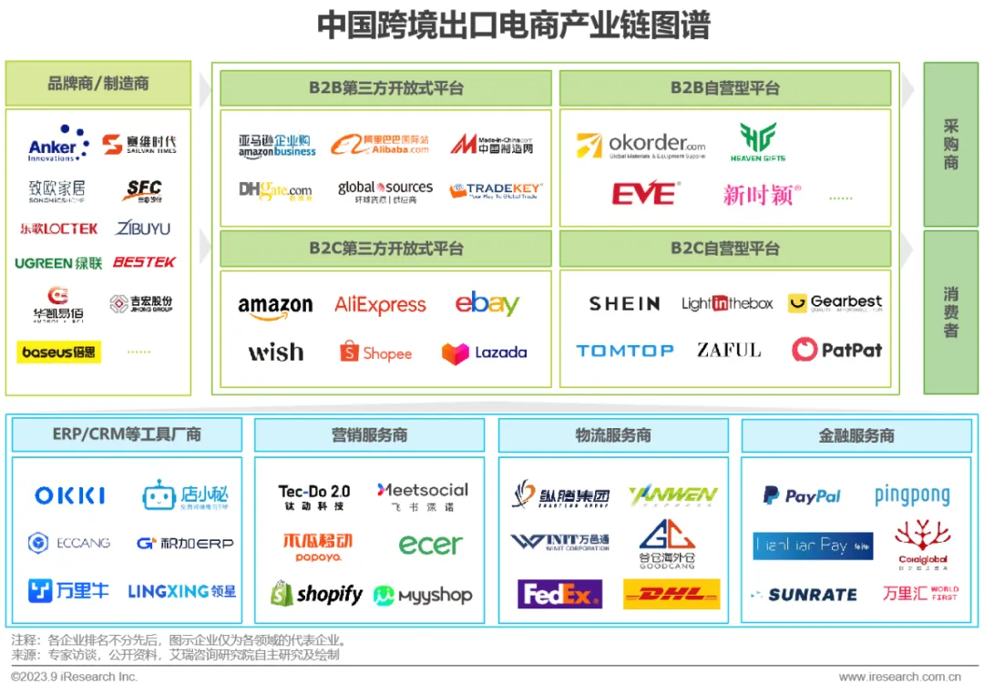 服务商:服务商运用自身能力帮助跨境企业补全和优化业务链条,外部服务商与跨境卖家紧密的供需关系加速推动了行业生态体系建设,为行业良性发展创造更多价值。