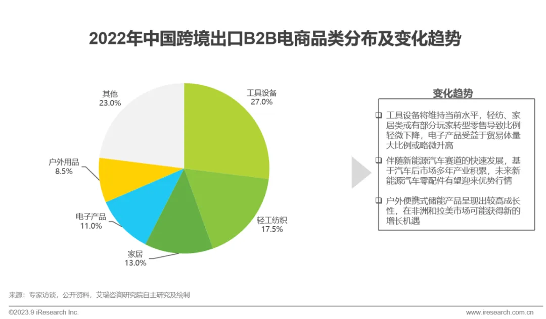 凭借制造业优势,工具设备、轻工纺织和家居产品稳居跨境出口B2B品类高位,多年的生产运营经验为这些品类的出口提供了良好的产业基础,产品分布现状短期内会保持稳定。基于政策发展导向和行业结构变化的综合考量,新能源汽车零配件与户外储能产品有望成为B2B出口电商潜力品类,在非洲、拉美等能源欠发达地区找到新的市场机会。