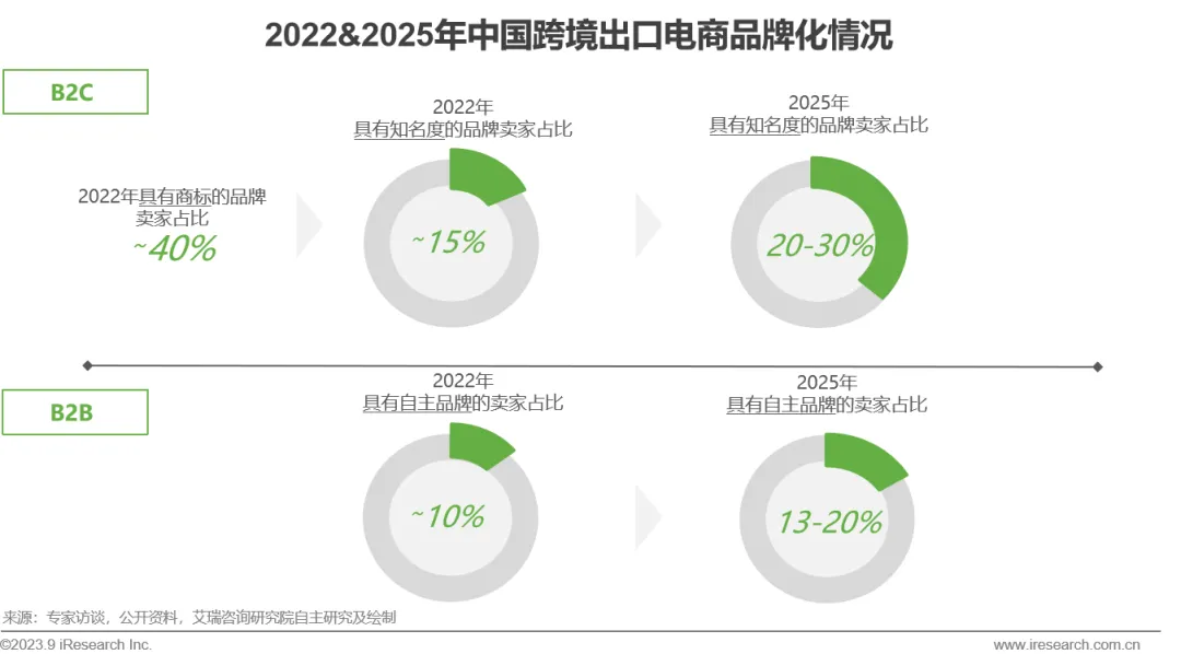 受到平台规则和产业成熟度等多重因素影响,跨境出口卖家从早年以白牌、低附加值产品为主逐步向品牌化、高附加值的产品进行探索。若以商标注册为衡量标准, 2022年跨境出口B2C电商领域已有近四成卖家实现了“商标化”布局,但若以知名度为品牌化标准,仅有不到两成的卖家实现了有效的品牌化布局。同时,在B2B领域若以拥有自主品牌而非贴牌代工为标准,当前仅有约一成卖家的品牌化路径行之有效。具体来看,得益于近消费终端的属性,B2C产品品牌化程度整体优于B2B领域。未来在品牌化发展的大趋势之下,预计2025年B2C和B2B品牌化率将分别达到20-30%和13-20%,品牌化率的提升在带动产业链转型的同时也会有助于企业利润率的优化和管理能力的提升。