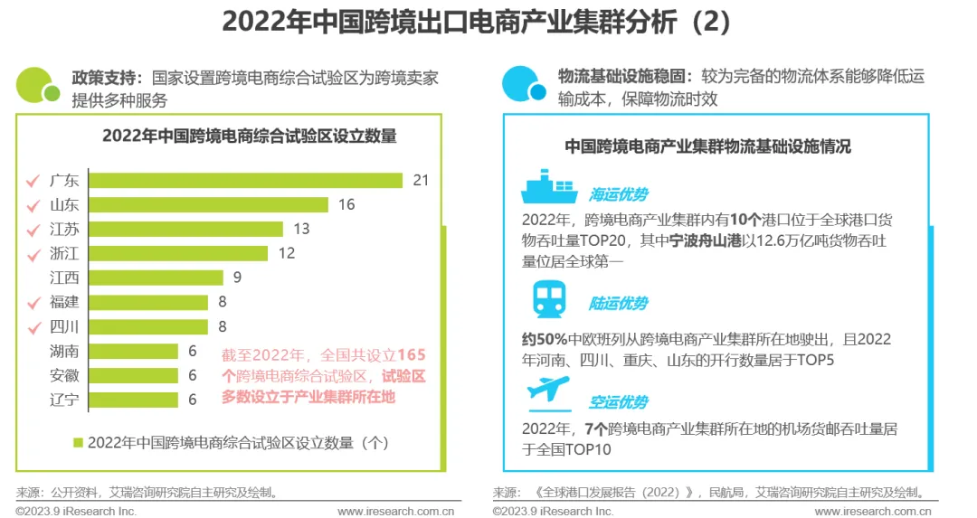设立跨境电商综合试验区能够促进产业链各主体的分工协作,进而实现区域资源整合,为跨境卖家“走出去”提供多种服务,提升跨境卖家出口效率,助力外贸新业态高质量发展。截至2022年底,全国共设立165个跨境电商综合试验区,实现31省市区全覆盖,其中跨境电商产业集群所在地分布多个试验区,政策优势明显。除政策支持外,跨境电商产业集群所在地拥有较为完备的物流体系,“海陆空”基础设施较为稳固,能够有效降低跨境卖家的运输成本,并提升其运输效率。