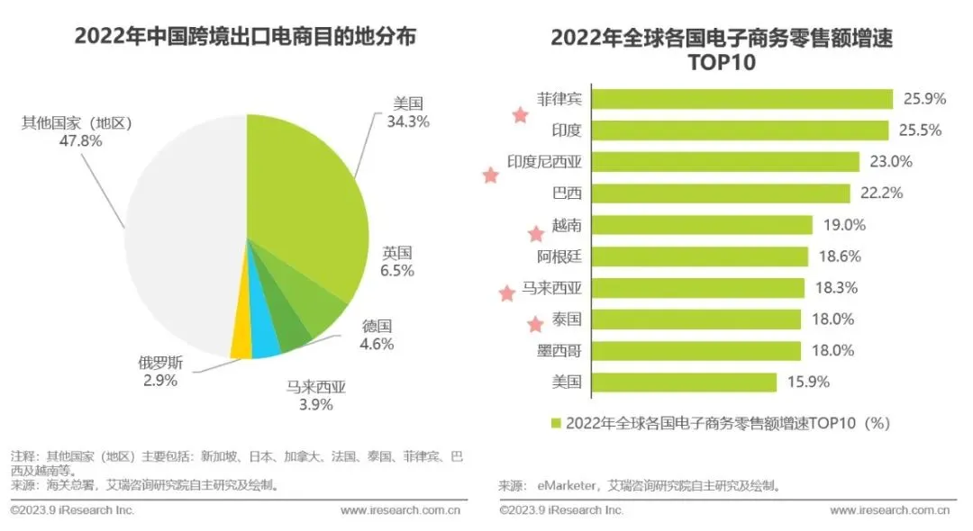 据海关总署数据知,美国为中国跨境出口电商第一大目的地,欧美等成熟市场仍为中国跨境卖家的主要目标。随着相关自由贸易协定与《区域全面经济伙伴关系协定》政策的落地,新兴市场逐步成为跨境卖家新一轮的“掘金点”,中国跨境出口电商的贸易伙伴趋于多元化。从零售端观察,五个东南亚国家电子商务零售额增速居于全球TOP10,电商生态欣欣向荣,相较于较为饱和的欧美市场,东南亚市场正在逐步崛起。