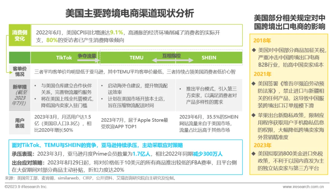 美国电商发展起源较早,已形成较为成熟的电商体系,其中亚马逊为美国的头部电商平台。但在美国经济下行期,以TikTok、TEMU与SHEIN为代表的跨境电商平台一跃而起,基于低价策略开发美国消费市场,由于三者在受众人群及供应链等方面存在重合,导致内部竞争激烈,与此同时会对外逐步侵蚀其他平台的市场份额,渠道竞争进入白热化阶段。此外,美国政府陆续出台相关贸易保护政策或其他相关规定,对中国跨境出口电商行业造成多方位冲击,增加跨境卖家出口难度。