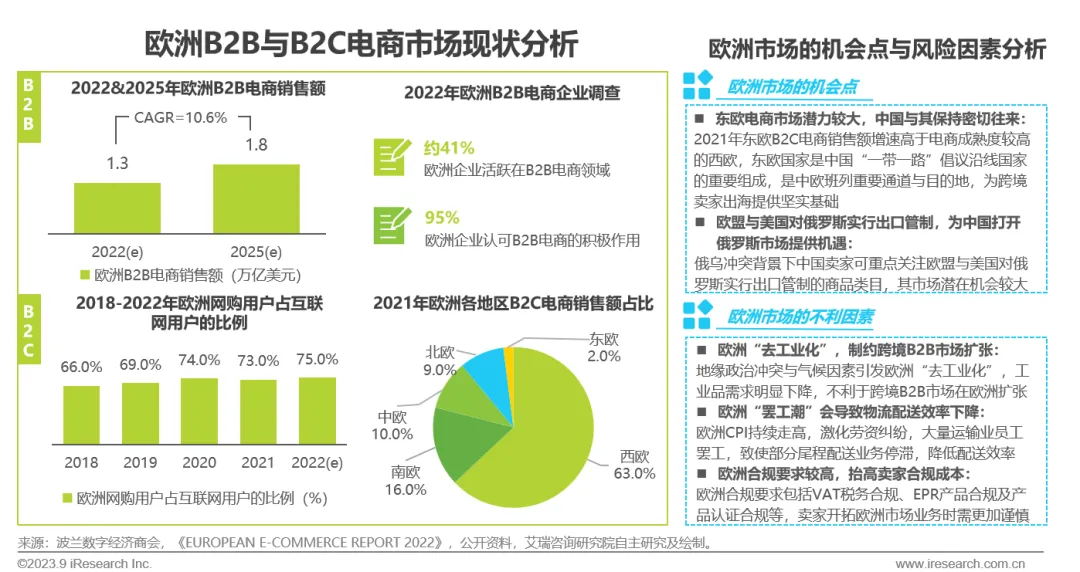 新冠疫情培养了欧洲企业采购商与消费者的线上购物习惯,预计2025年欧洲B2B电商销售额将达到1.8万亿美元,约41%的欧洲企业积极介入B2B电商;从C端来看,2022年欧洲网购用户占互联网用户的比例将达到75%,逐步趋近于同年中国网购用户渗透率(79.4%)。从区域分布看,西欧B2C电商市场发展最为成熟,2021年电商销售额占整体欧洲市场的比例达63%。此外,东欧电商销售额增速强于西欧,市场潜力较大,跨境卖家可借助国家战略支持积极开拓。但不可否认,跨境卖家面对欧洲市场需克服“去工业化”、“罢工潮”以及高合规要求等困难,需要重视可能存在的风险因素以避免损失。
