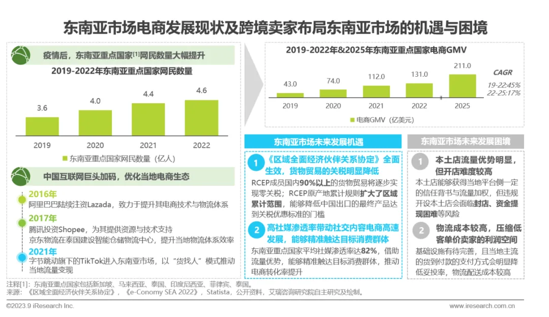 新冠疫情驱使东南亚重点国家网民数量增长近1亿人,加之中国互联网巨头加码等利好因素,2022年东南亚重点国家电商GMV已达131亿美元,预测2025年将达到211亿美元,CAGR达17%。《区域全面经济伙伴关系协定》全面生效后,中国与东南亚市场的货物贸易关税将进一步下降,且社媒的流量优势能够驱动当地电商转化率提升,但跨境卖家开设本土店铺的难度较高,且相对较高的物流配送成本会挤压利润空间,这均会制约东南亚市场的高速发展,未来伴随电商生态环境的持续优化,其现实困境有望逐步纾解。