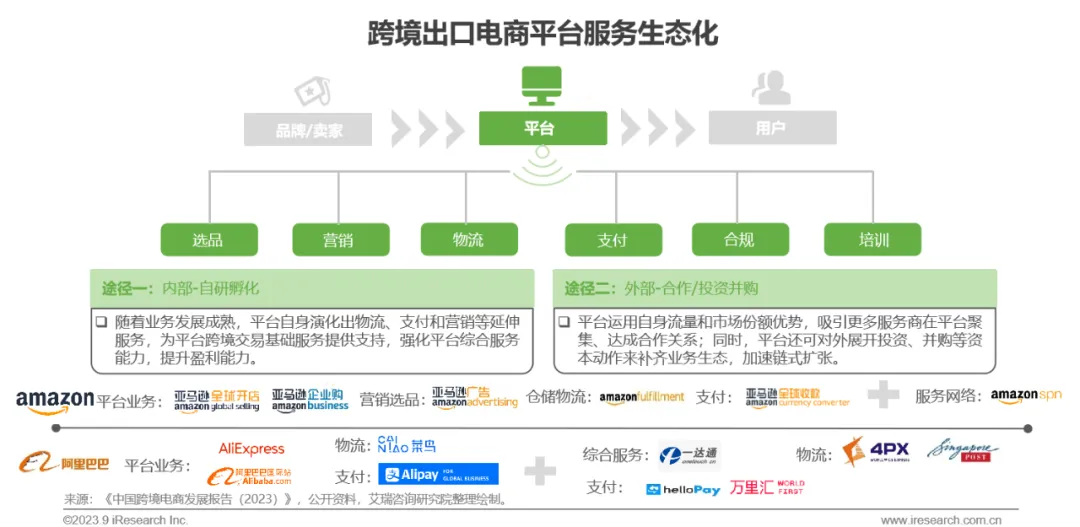 作为跨境电商生态链的核心组成部分,跨境电商平台以为上下游提供交易服务为基础,业务链条逐渐延伸至选品、营销、物流、支付、合规等增值型服务领域,显现出生态化趋势。生态布局策略通常分为内部能力拓展和外部投资/合作,头部玩家基于自身特征与优势,或侧重内部孵化、吸引服务商集聚,或基于平台基础加大投资并购力度拓宽能力象限。头部平台将会保持经营策略,持续扩容服务生态、加速链式扩张,未来新兴玩家随着业务成熟亦会跟随头部玩家的步伐展开生态化布局,提升自我竞争力和货币化能力。