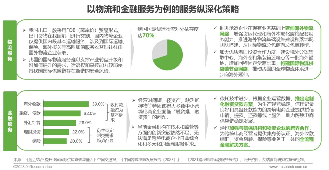 随着行业的成熟发展,服务商作为跨境产业链软硬件配套设施关键供给方的重要性得到凸显。以物流和金融服务为例,我国跨境服务的自主性和韧性还有待进一步的加强,未来发展的策略方向一方面将会来自于海外硬件设施和关键节点的建设或合作,另一方面则会来自对用户需求方向的深度洞察及相关科技应用的成熟进步。