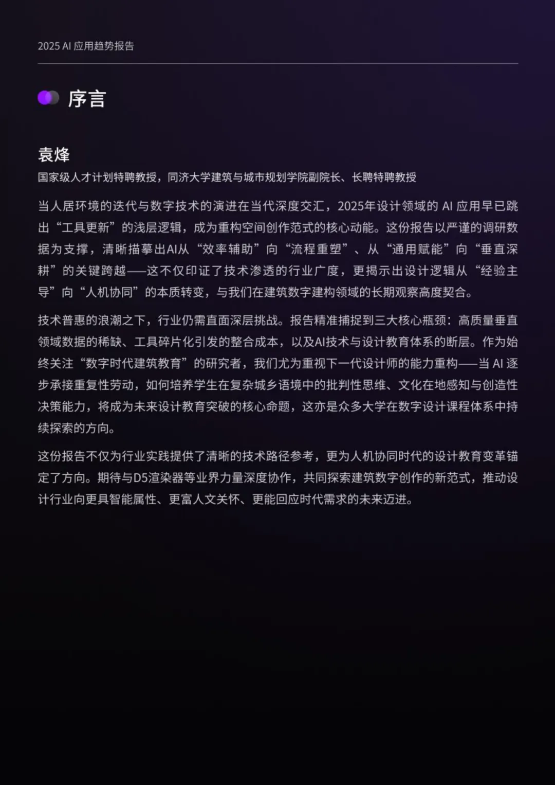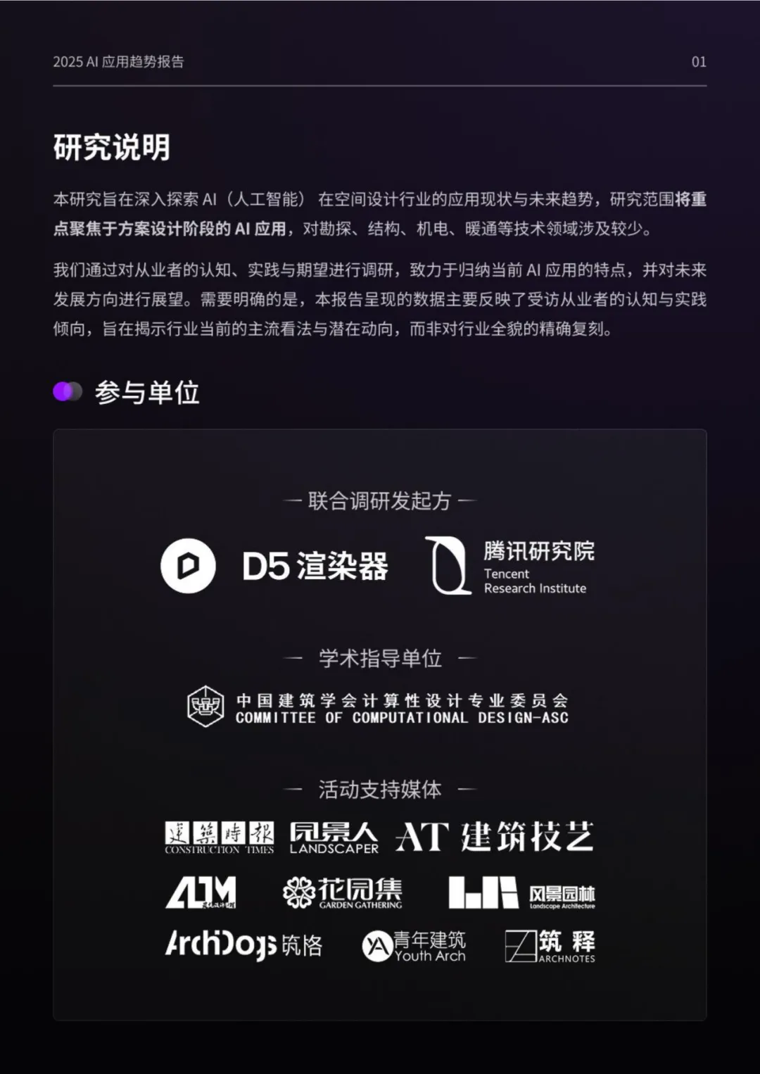 本报告由腾讯研究院与 D5 RENDER 联合发布,聚焦设计行业方案设计阶段的 AI 应用,基于 2490 份有效样本(国内 1825 份、海外 665 份),结合定量调研与定性访谈,核心结论如下: