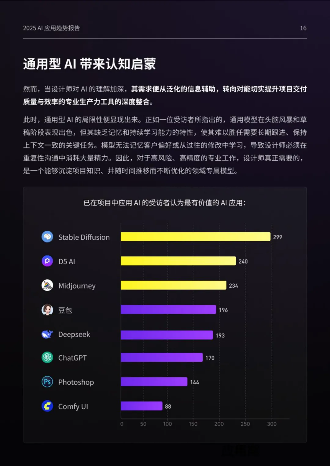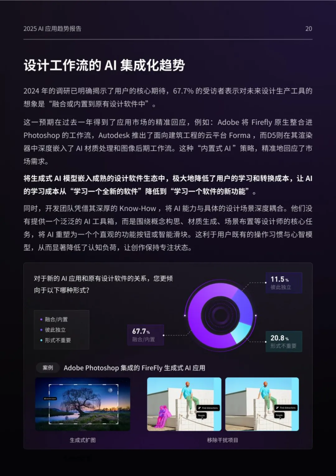 工具碎片化:57.9% 设计师需切换 2-3 个 AI,存在格式转换、心流中断成本,趋势是 “集成化”(如 AI Agent、超级应用)。
