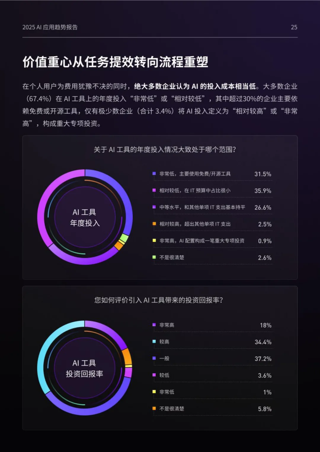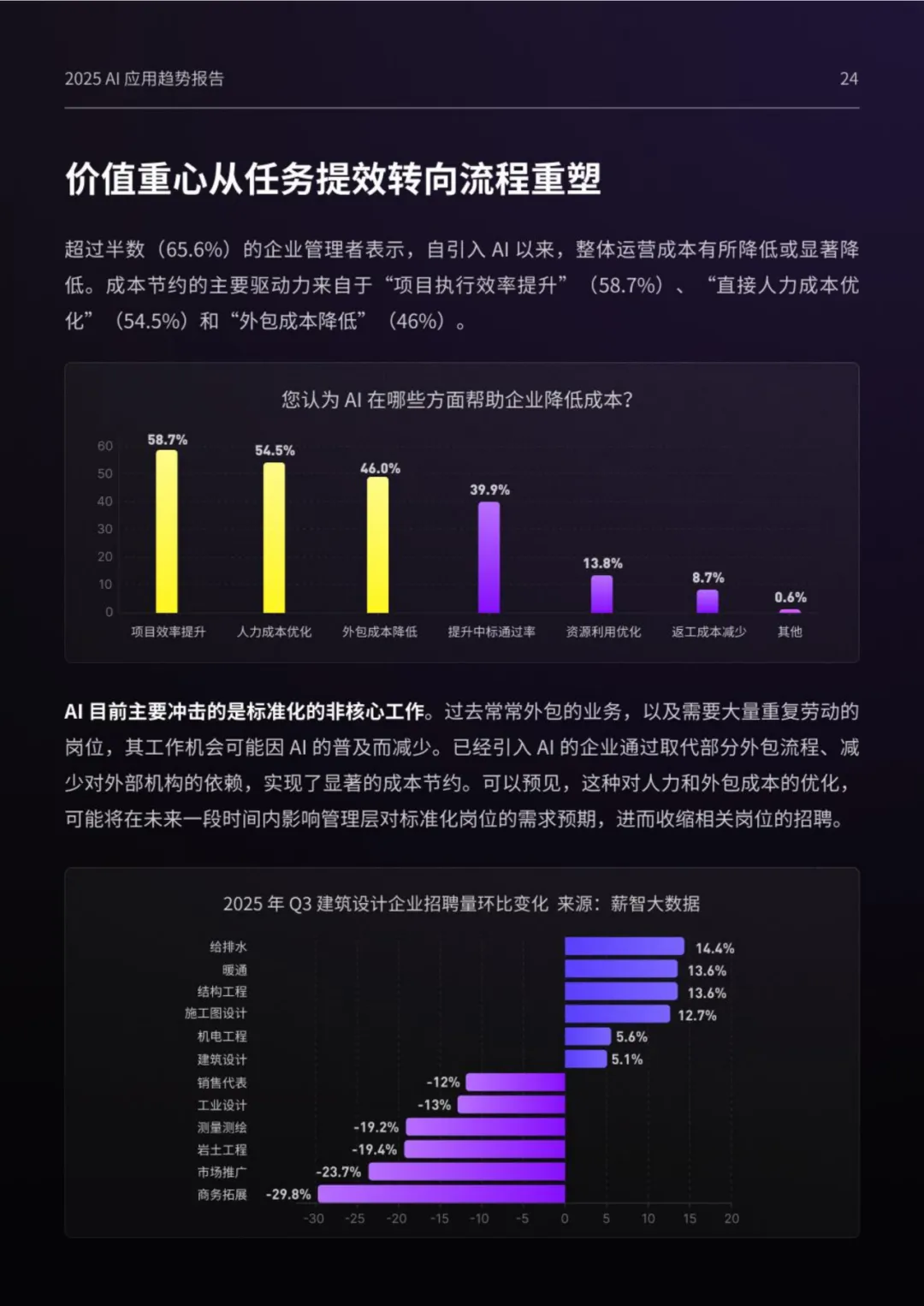 价值重心转移:从 “任务提效” 转向 “流程重塑”,成本成新障碍(国内 37.8% 因 “AI 需付费” 不用,海外 36.8%);65.6% 企业成本降低,主要靠项目效率提升(58.7%)、人力优化(54.5%);