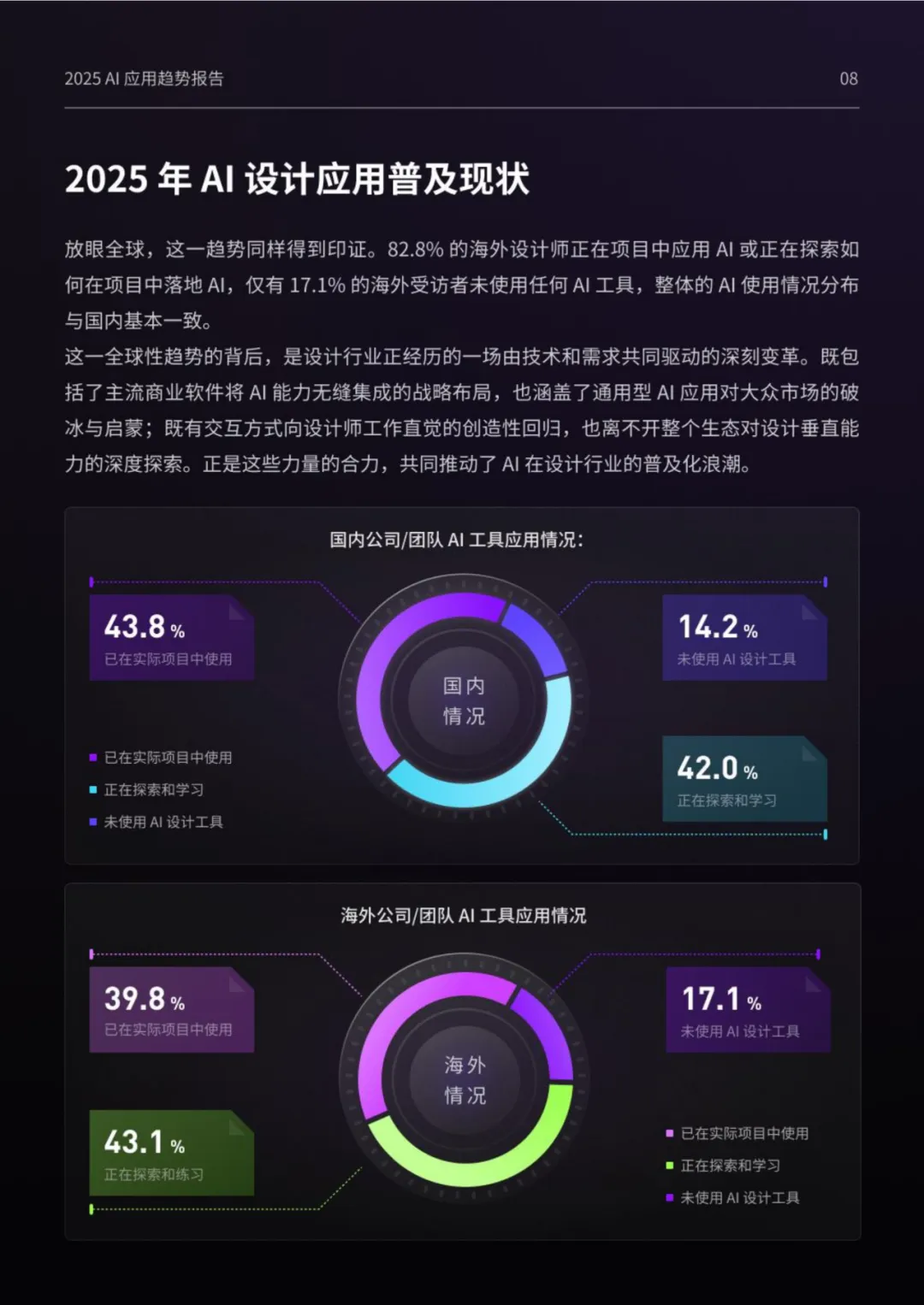 普及度大幅提升:2025 年行业 AI 使用率达 85.8%,43.8% 受访者已在项目中使用(2024 年仅 25.7%),未使用比例从 37.9% 降至 14.2%,海外趋势类似(82.8% 使用或探索);