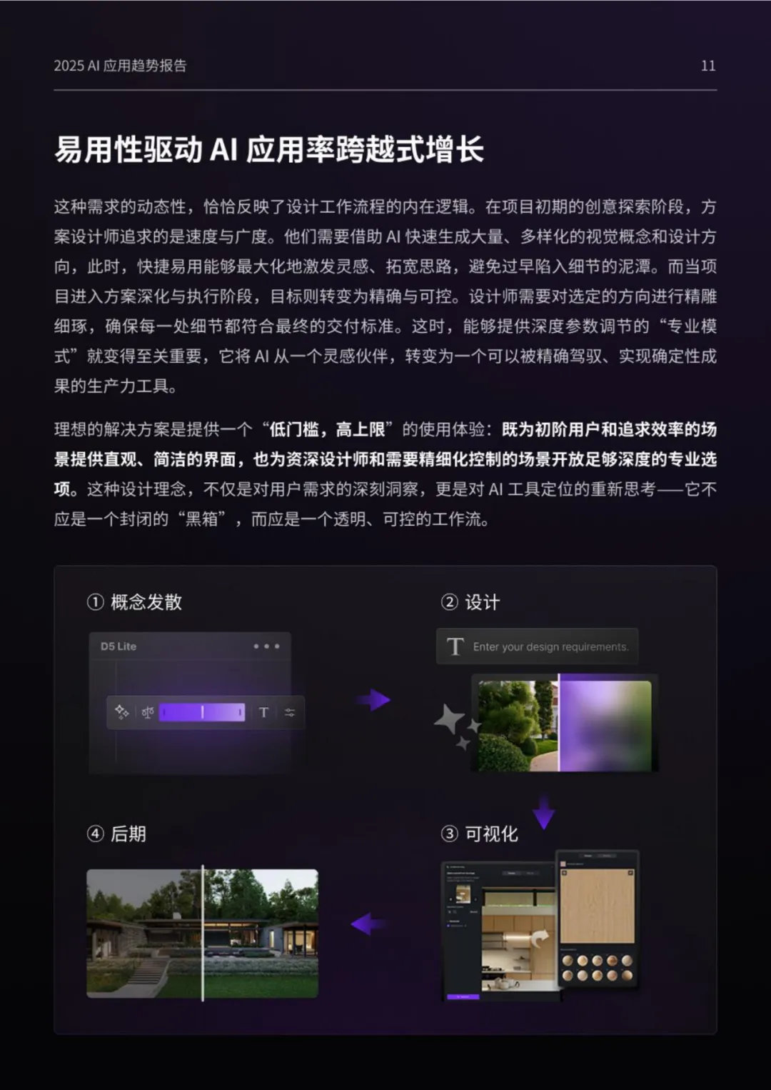 工作流集成:Adobe、D5 等将 AI 内置进原有软件(如 D5 的 AI 材质处理),降低学习成本。