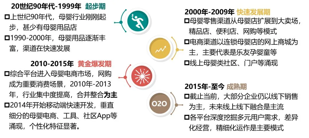 母婴行业起步于上世纪90年代,起初只是一些零星的母婴店铺,2000年后行业快速发展,零售渠道逐步扩大;2010年以来行业进入黄金爆发期,综合电商平台崛起;2015年至今,行业逐步成熟,线上线下渠道逐步打通。