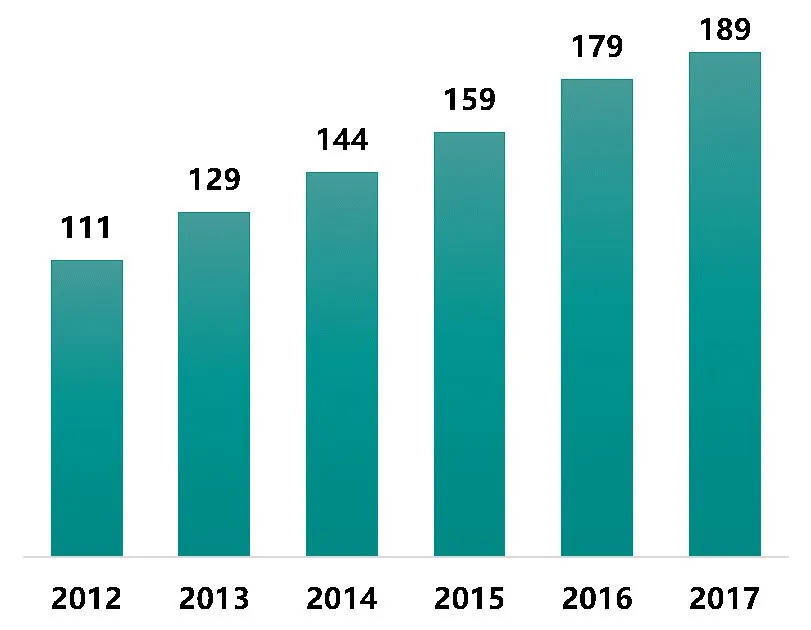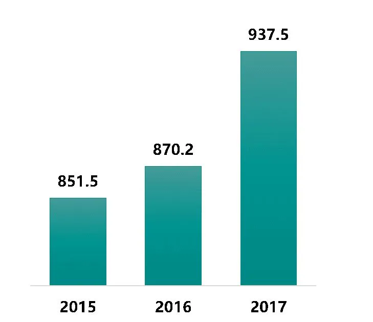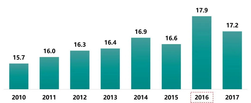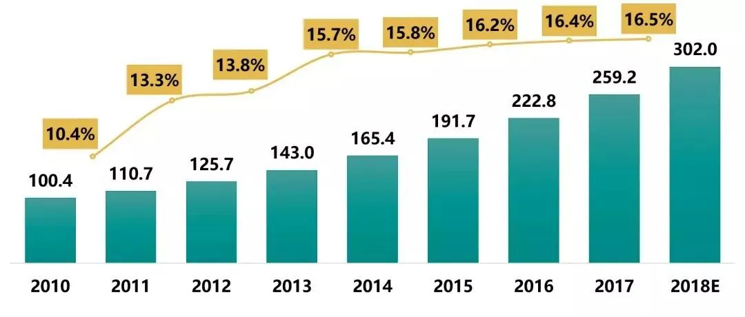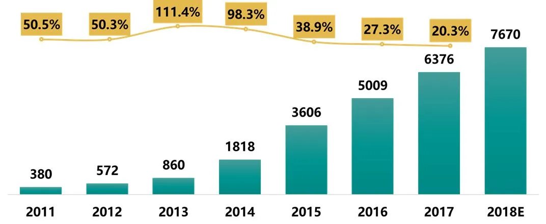 2017年突破6000亿大关,2018年预计将达到7670亿。