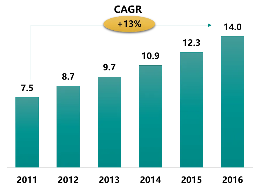 婴幼儿消费在 2011 年至 2016 年间保持快速增长的态势,2016 年达到14000 元左右,年复合增长率持续维持在 12%以上。新一轮的人口放量和人均消费的提升都将带给母婴行业整体巨大的扩容空间。